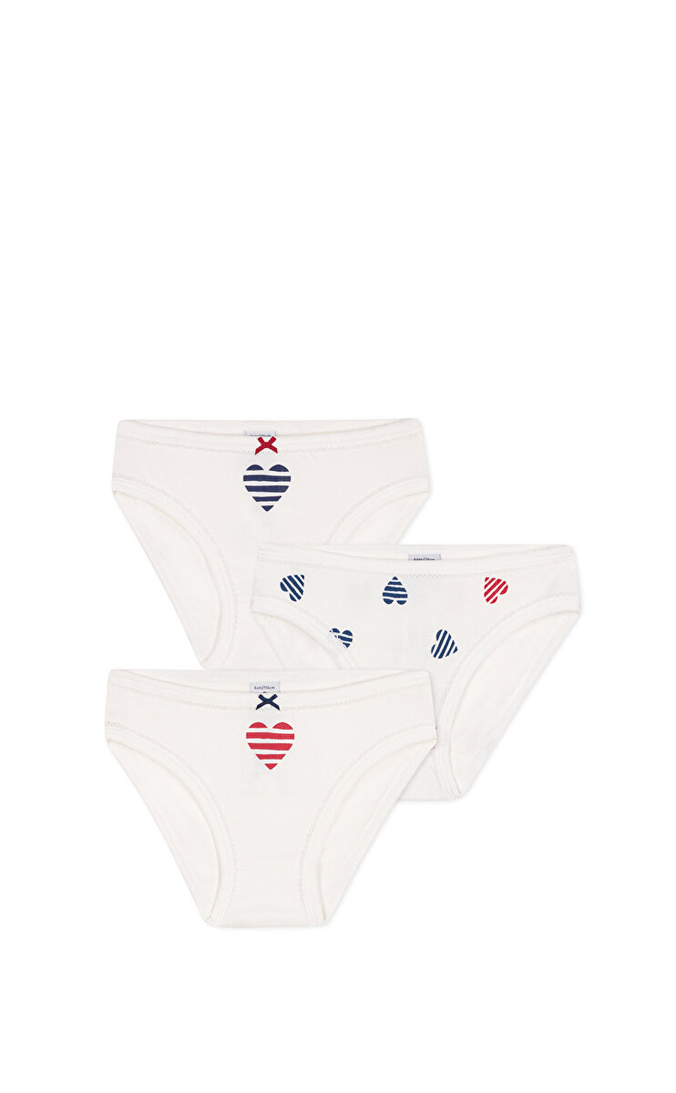 3'lü kız çocuk külot paketi. Paket, iki adet çizgili kalp baskılı ve bir adet düz kalp baskılı külottan oluşur. Piko dikiş ve düz olanında kurdele detayı vardır.