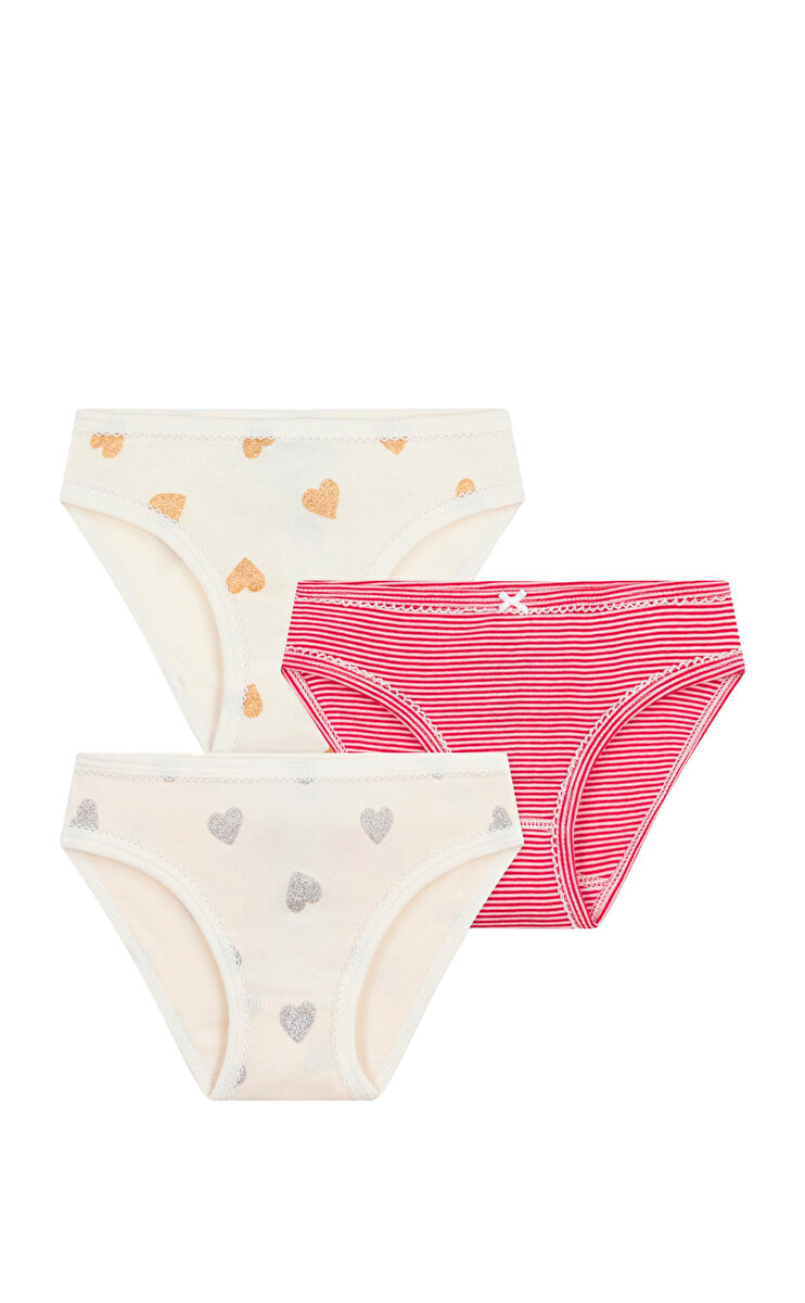 Esnek ve rahat bir kumaş olan 1x1 ribana örmeden yapılmış, 3'lü paket kız çocuk külotu. Bu paket, iki baskılı ve payetli kalp desenli ve bir ince çizgili 1x1 ribana külot içerir. İkonik kalp desenimiz, festivaller için bir payet fırtınası ile süslenmiştir! Piko detaylı ve çizgili külotta bir fiyonk bulunur.