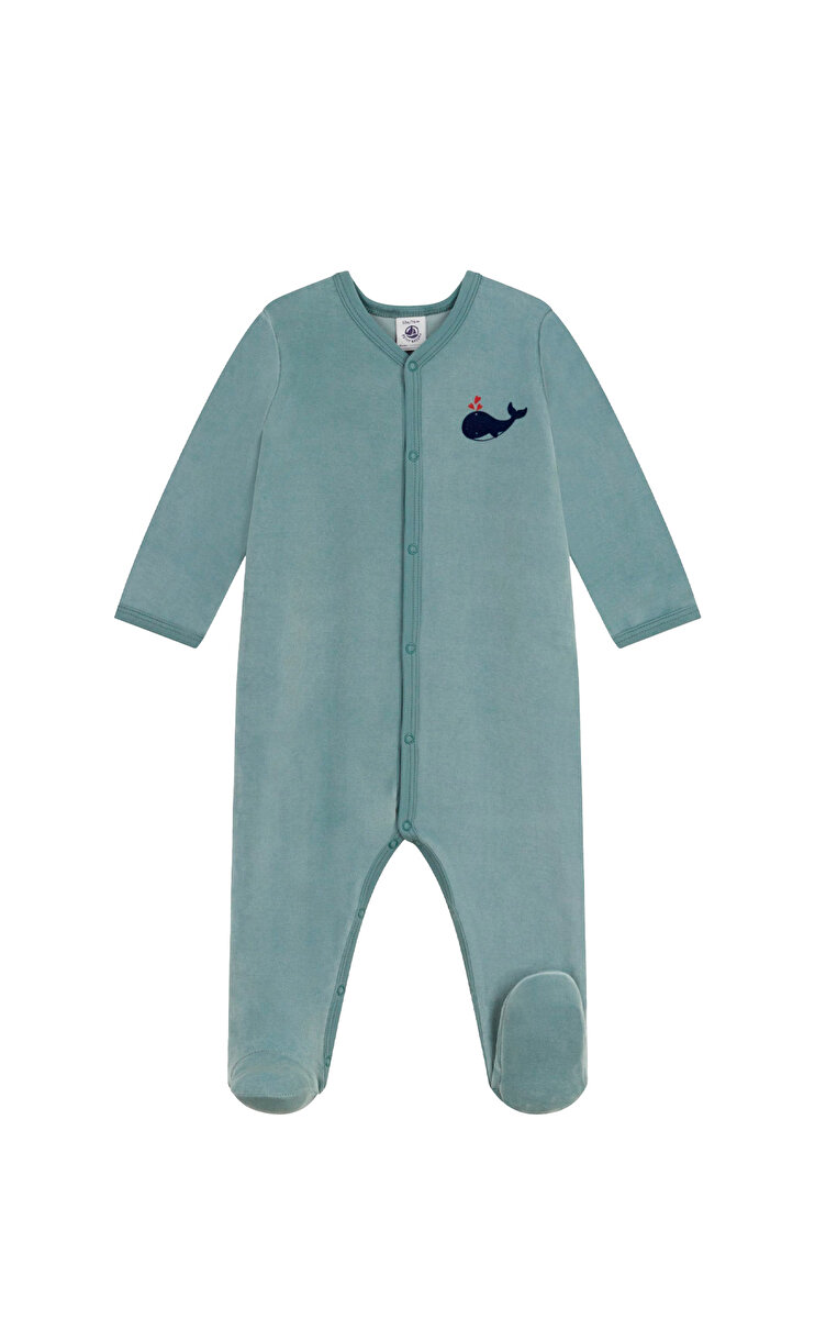 Düz renk, havlu kadife kumaştan bebek tulum pijama. Sıcak ve zarif bir kumaştır. Pijama tulumu ön ve bacak arasında kopçalarla açılır ve kapanır.