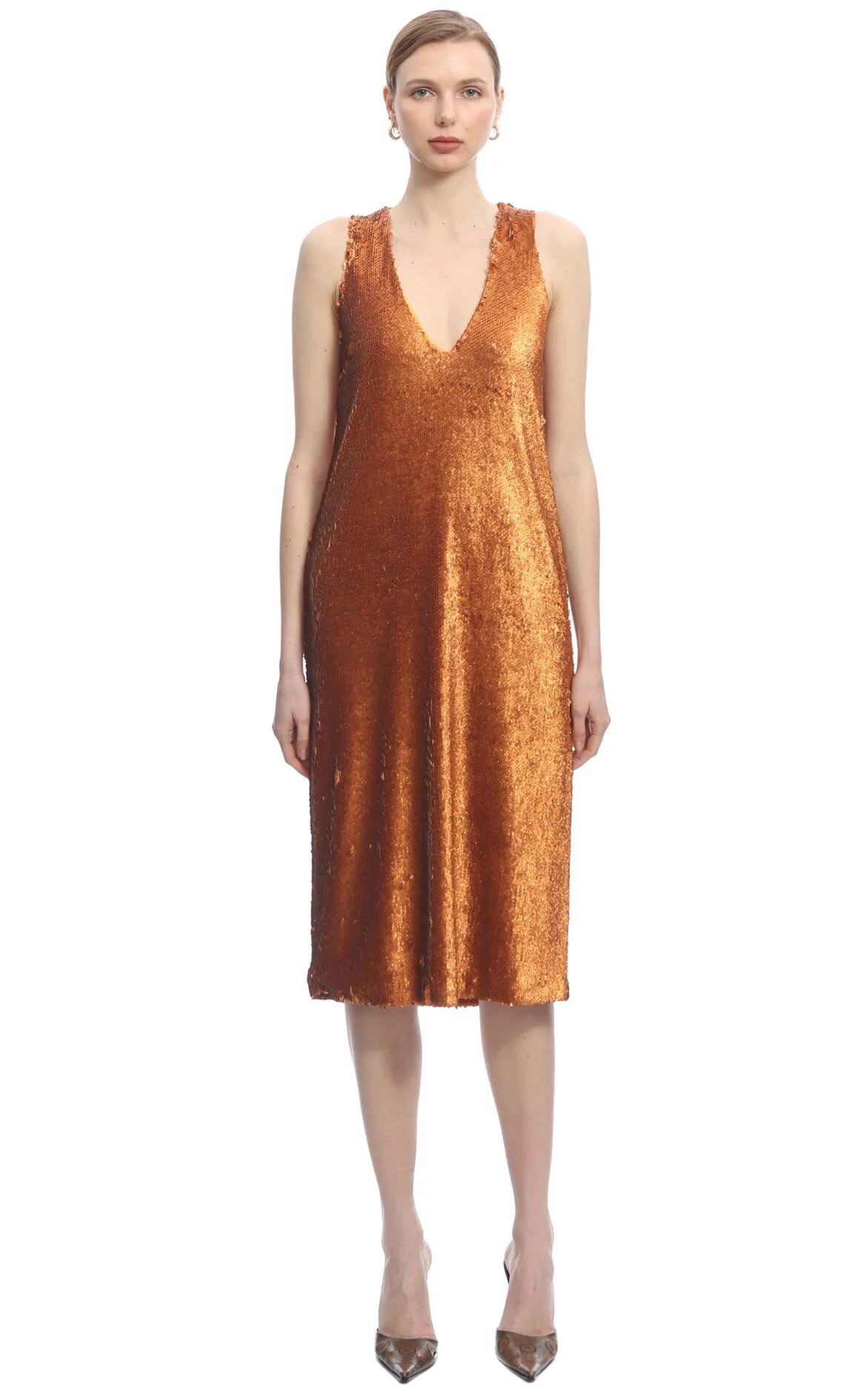 3. Turuncu Pul Payetli Kolsuz V Yaka Midi Boy Elbise