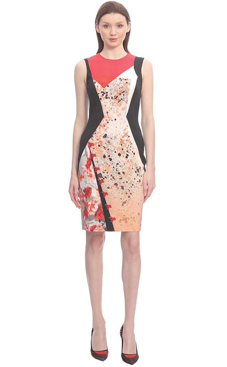 Sıfır yakalı, kolsuz, diz üstü, karışık desenli, renkli Prabal Gurung elbise