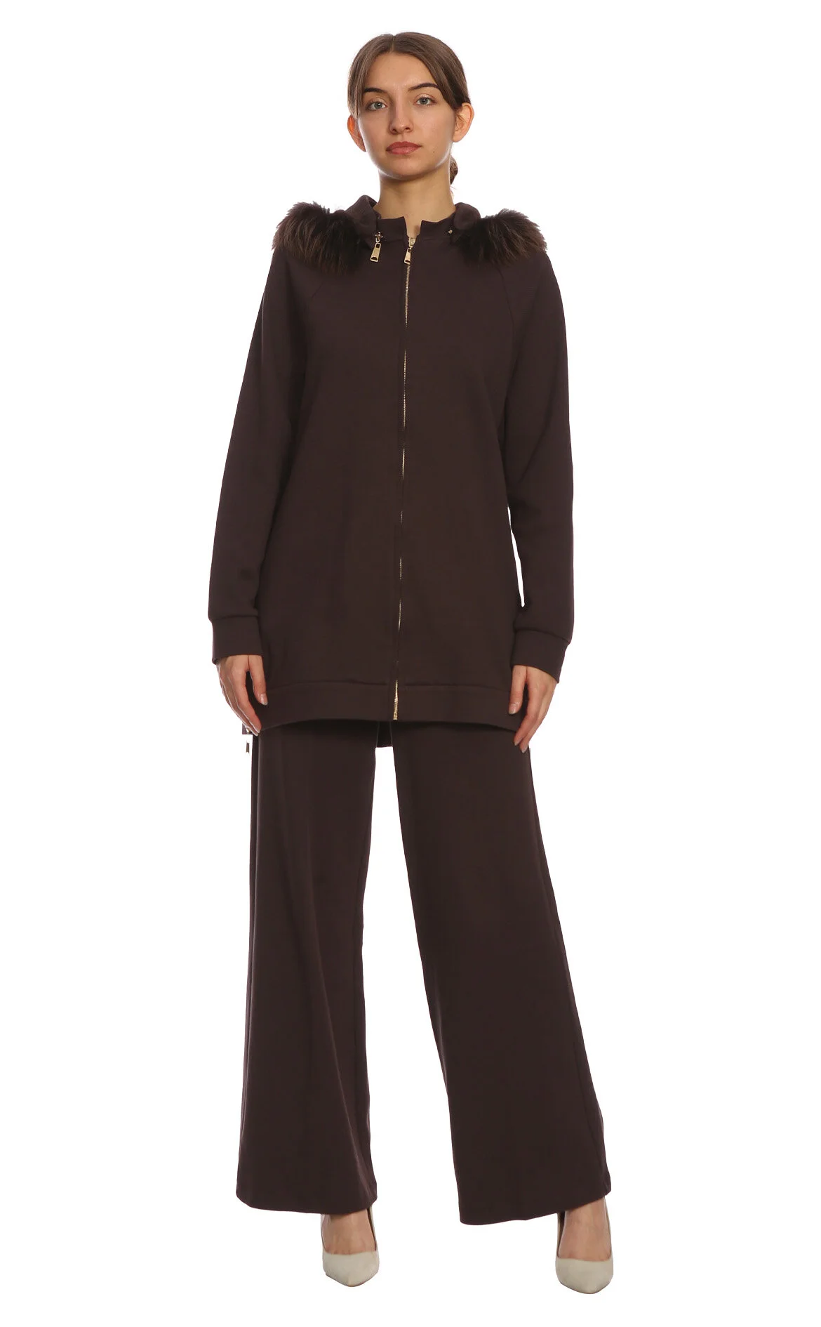 Qupra Kahverengi Uzun Kol Bol Paça Kadın Eşofman Takım