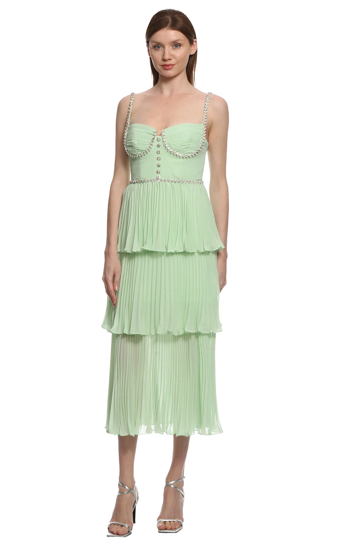 Self Portrait Yeşil Pileli Askılı Midi Boy Elbise