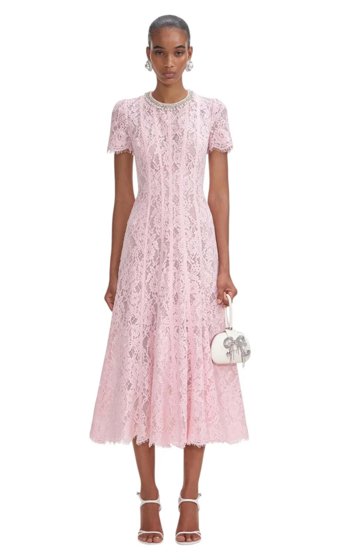 Self Portrait Pembe Dantelli Kısa Kollu Oval Yaka Midi Boy Elbise