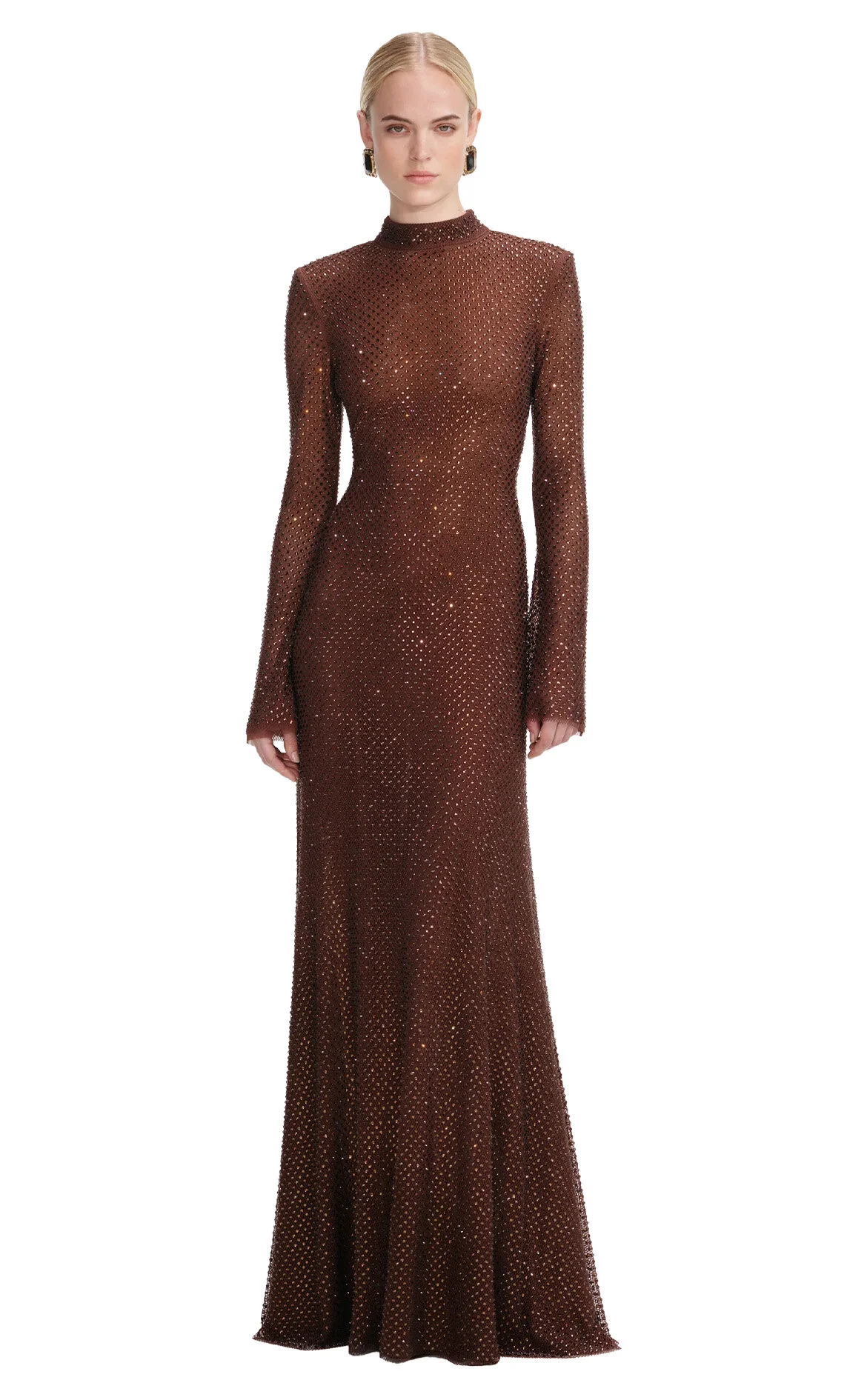 Self Portrait Kahverengi Pul Payetli Uzun Kol Dik Yaka Maksi Boy Elbise