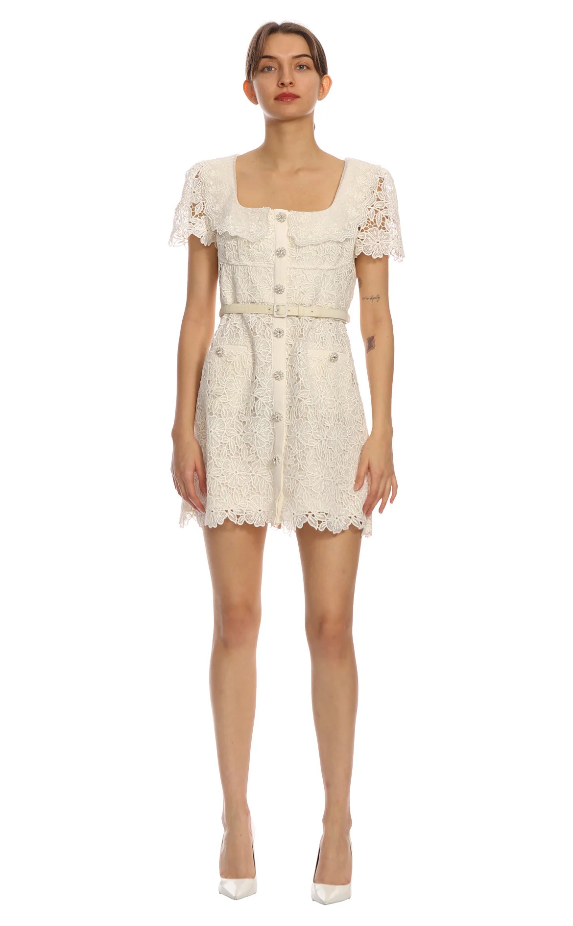 Self Portrait Krem Rengi Dantelli Kap Kol Oval Yaka Mini Boy Elbise