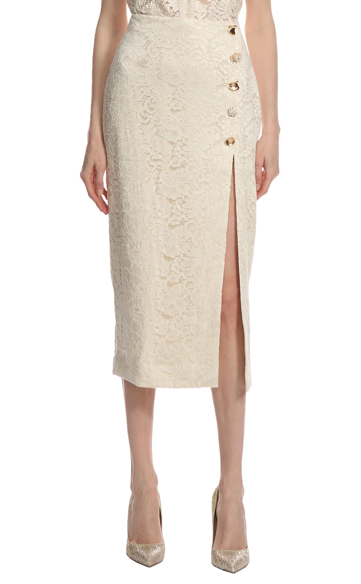 5. Krem Dantel İşlemeli Düğme Detaylı Midi Etek