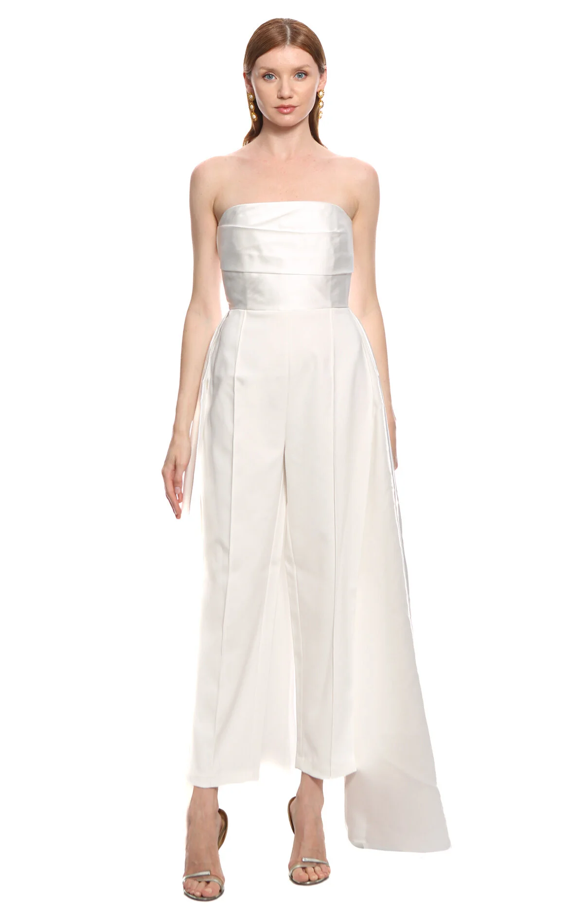 Solace London Krem Düz Desenli Kolsuz Straplez Yaka Tulum