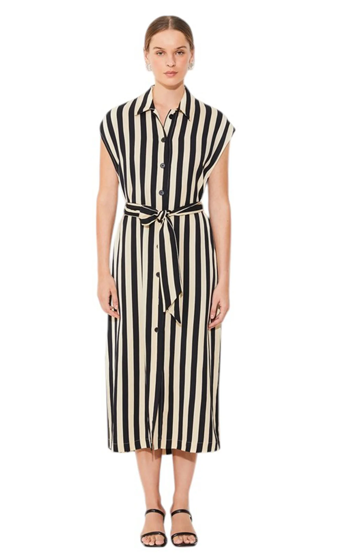 Suncoo Siyah Çizgili Kolsuz Oval Yaka Midi Boy Elbise