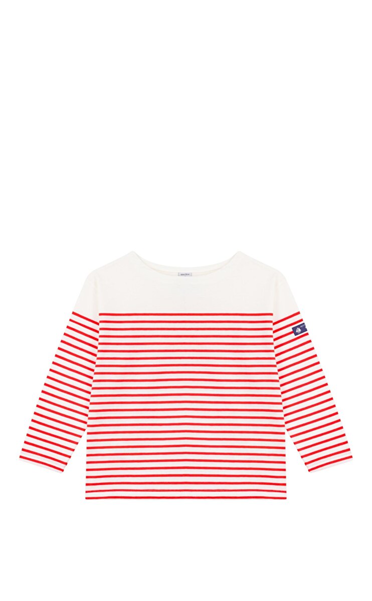 Düz kesim formuna sahip bu model, sol kolda yer alan Petit Bateau etiketi ile tamamlanmıştır. Denizci tarzı tişört, her gardırobun vazgeçilmez ve klasik parçalarından biridir.