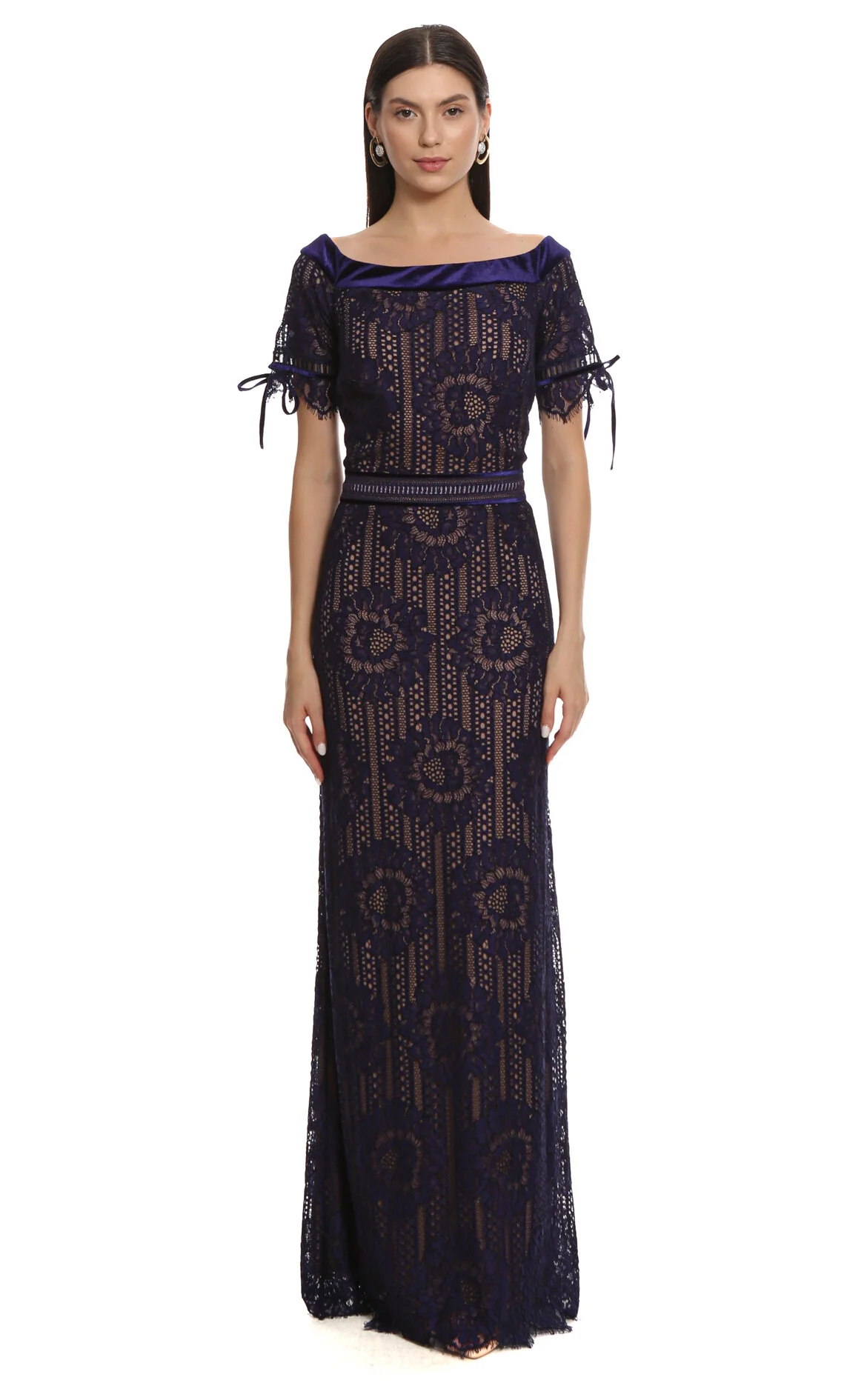 Tadashi Mor Dantel İşlemeli Kısa Kol Kayık Yaka Maksi Gece Elbisesi