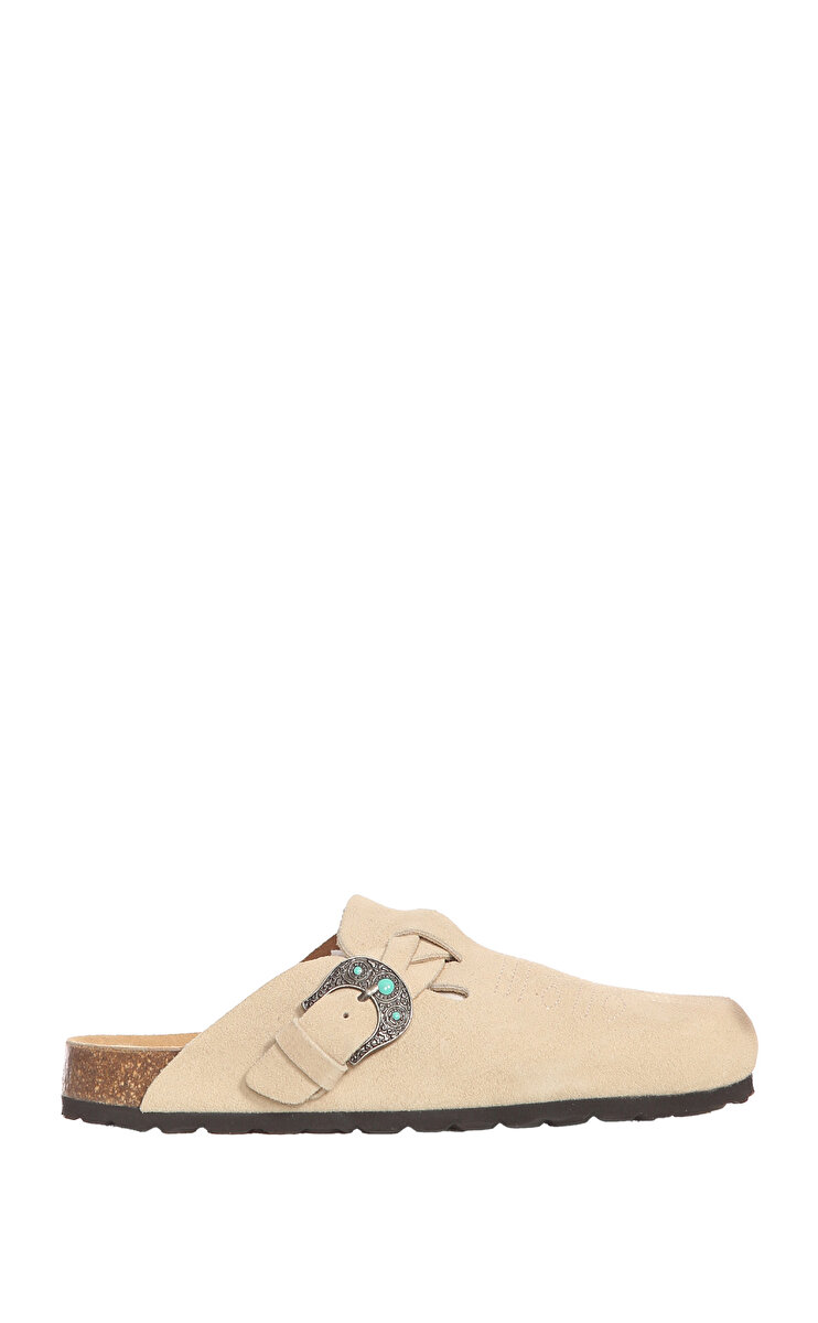 Oval burunlu, düz desenli, düz ökçeli, bej Taji terlik