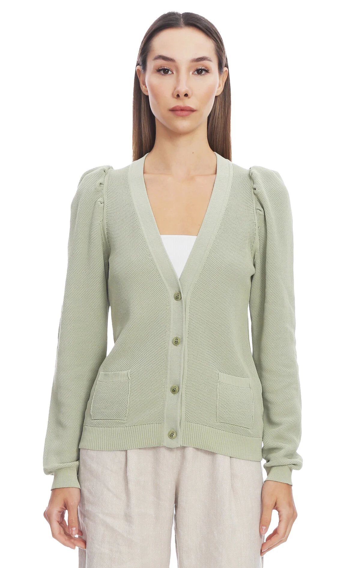 3. Su Yeşili Uzun Kollu V Yaka Pamuk Karışımlı Hırka