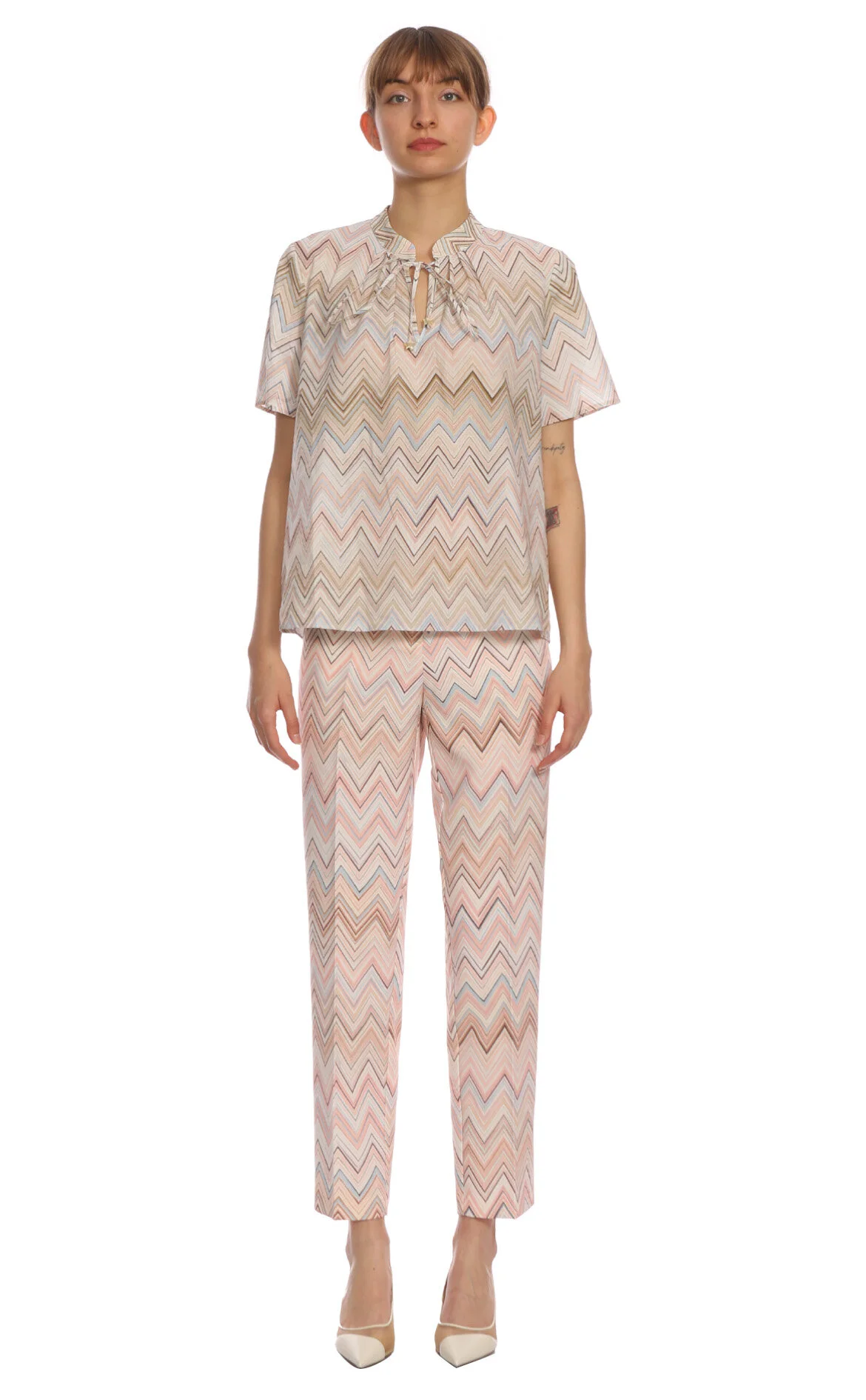The Abito Çok Renkli Zikzak Desenli Kısa Kol Hakim Yaka Pamuk Bluz
