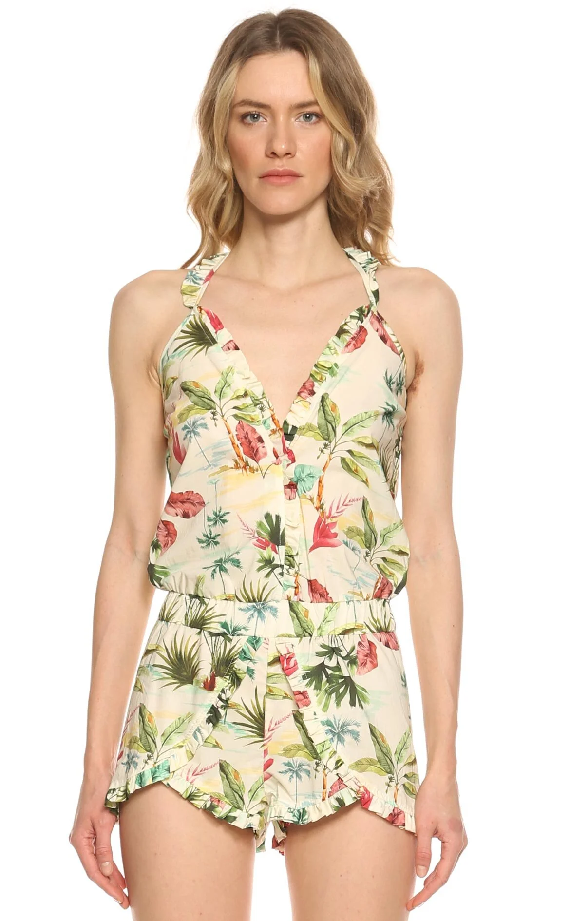 The Lazy Poet Çok Renkli Çiçek Desenli Askılı V Yaka Pamuk Tulum