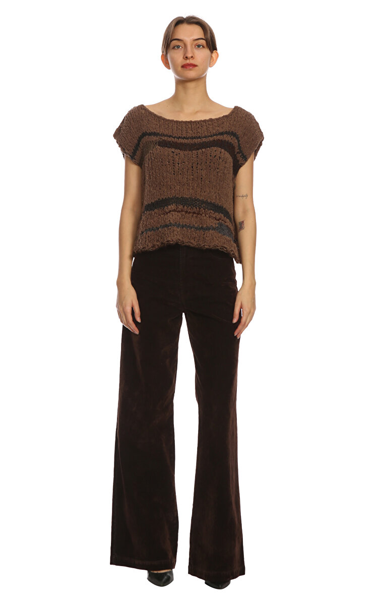Oval yakalı, sıfır kollu, çizgi desenli, kahverengi Ümit Ünal süveter