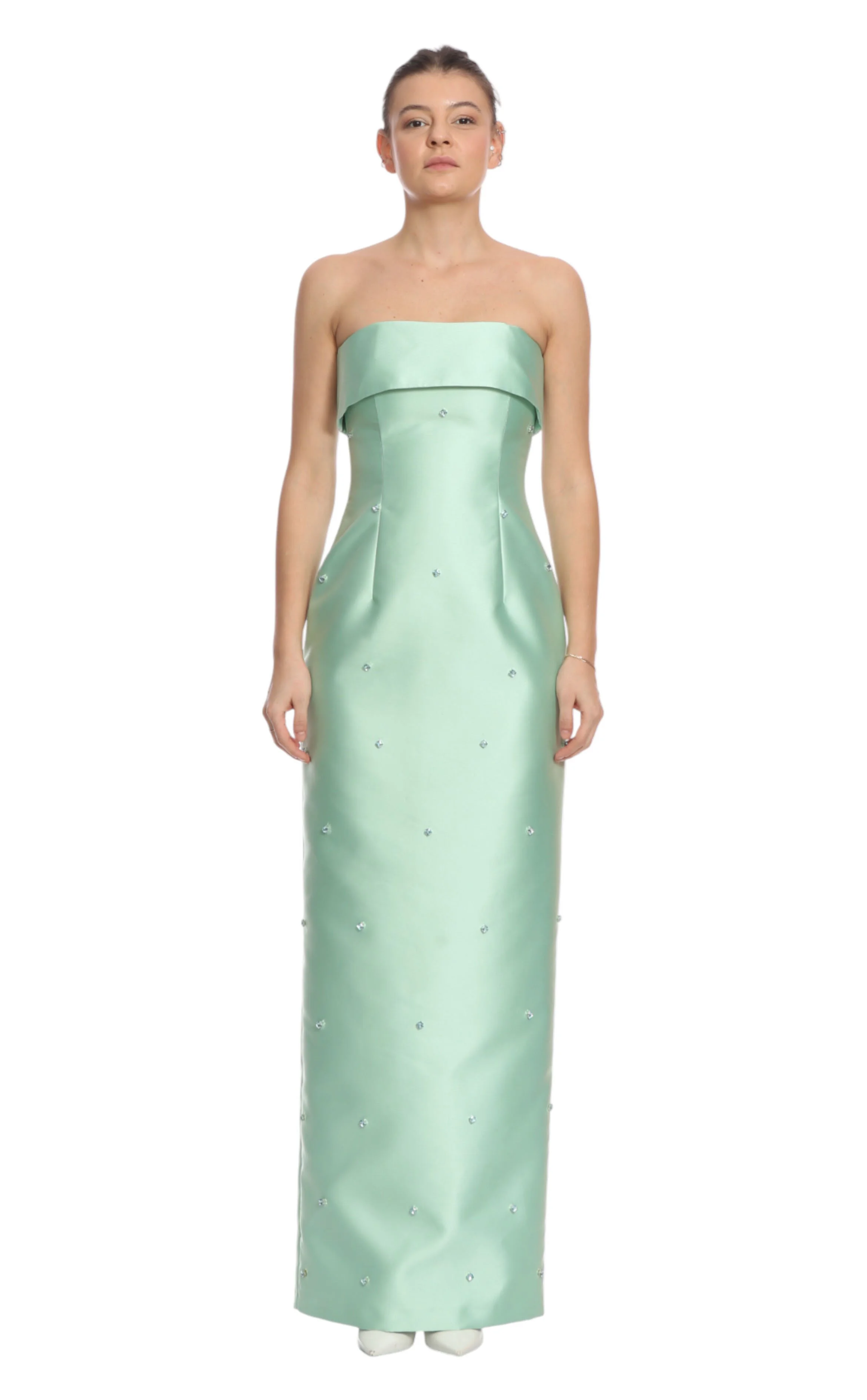 5. Mavi Taş İşlemeli Straplez Yaka Maksi Boy Elbise