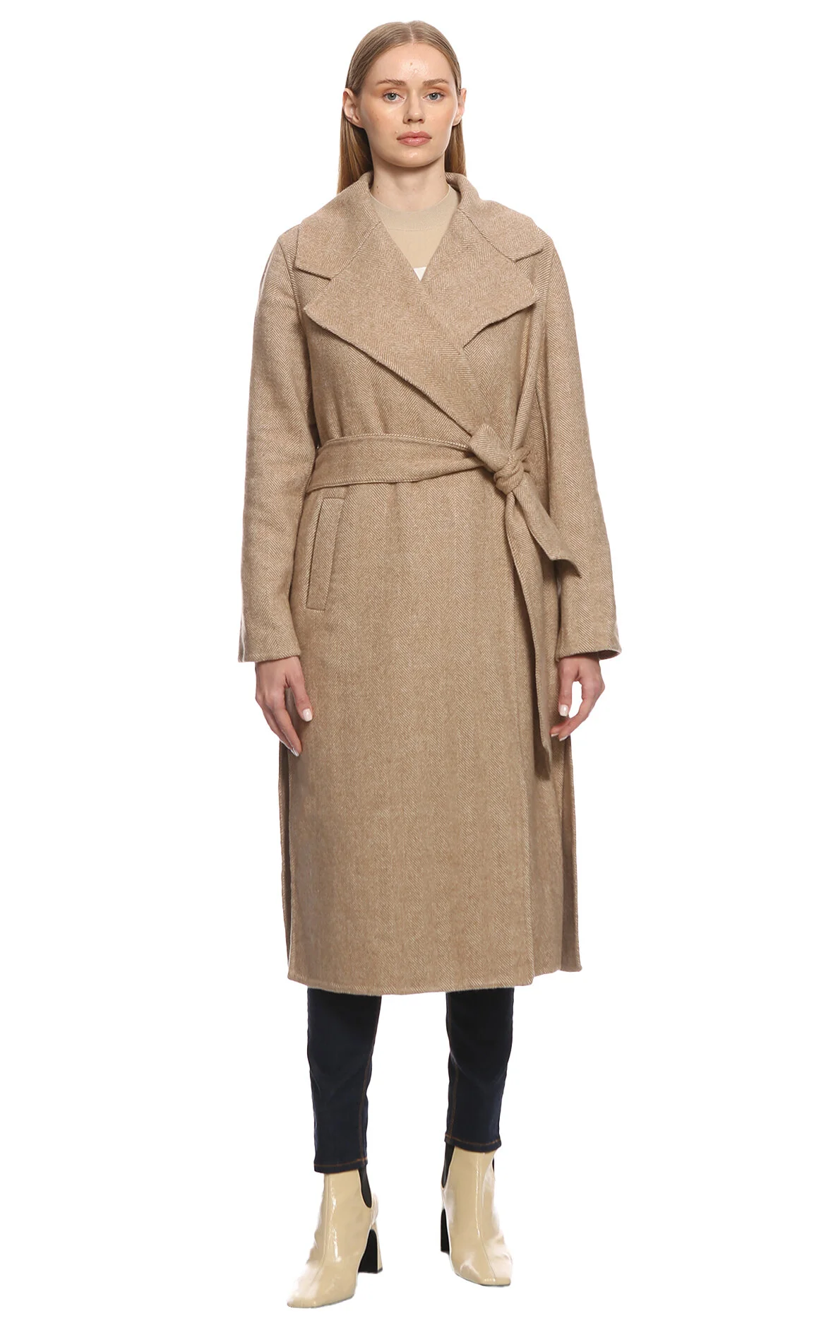 5. Camel Kemerli Kruvaze Yün Kaban