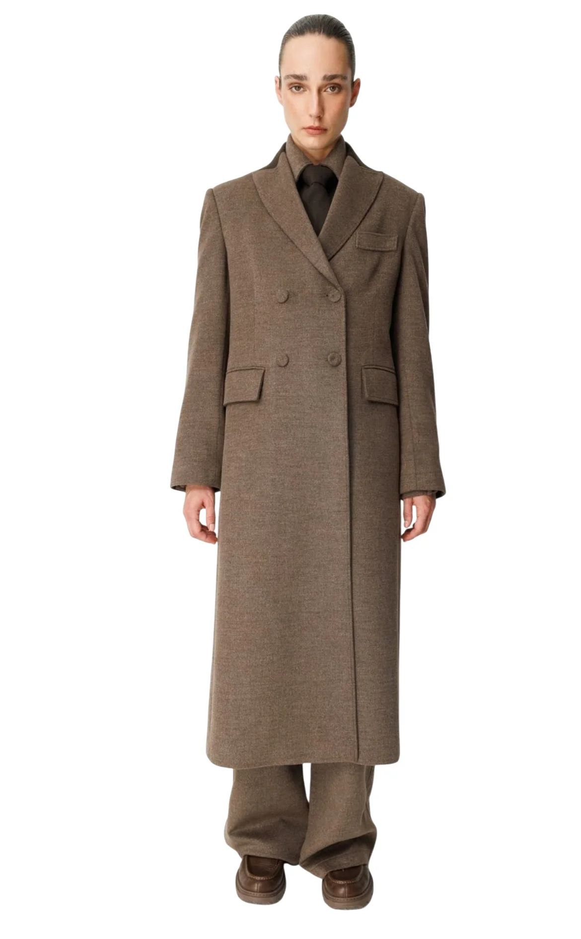 Wabi Sabi Kahverengi Düz Desenli Uzun Kol Kruvaze Kaban