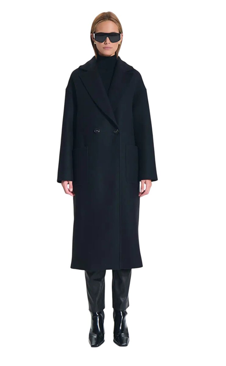 Kırlangıç yakalı, uzun kollu, düz desenli, lacivert Zapa kaban